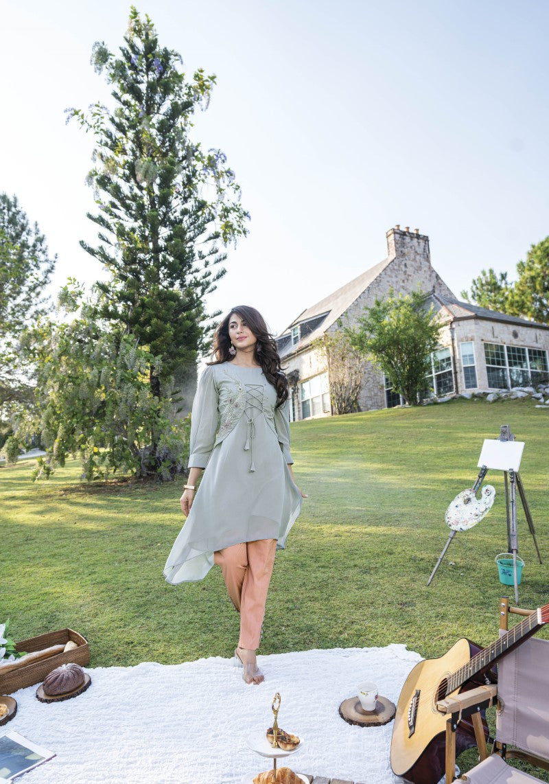 Invest in making a statement with this fabulous Designer Handwork Embellished Front Tie Top And Cotton Lycra Pant Co-ord Set. This ensemble is perfect for those of you who crave to stand out and make a unique fashion statement. The combination of heavy fox georgette and cotton lycra results in a dazzling appearance that portrays an edgy yet elegant vibe.