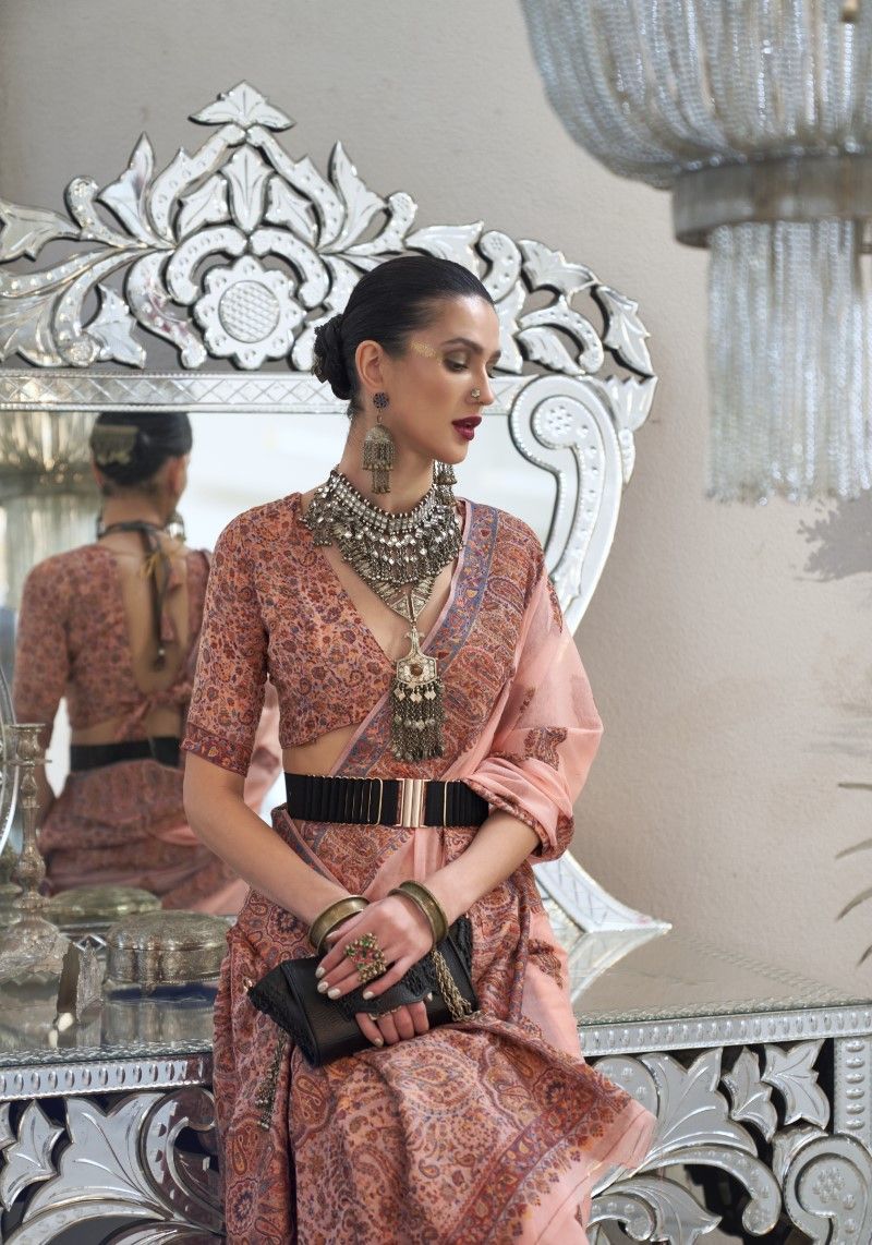 Flourished Blushed Peach Kashmiri Woven Art Silk Saree