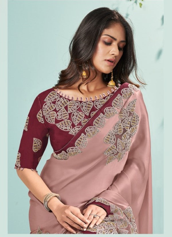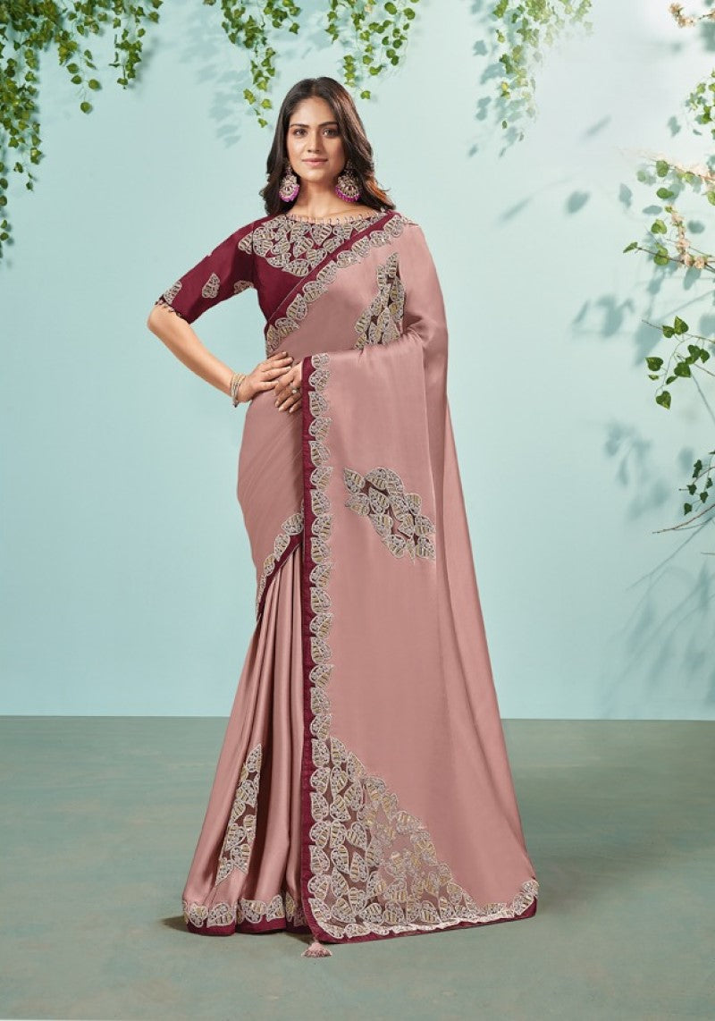Maroon Rose Satin Silk Cut-Work and Cord Embroidered Saree